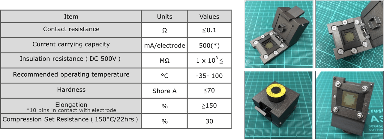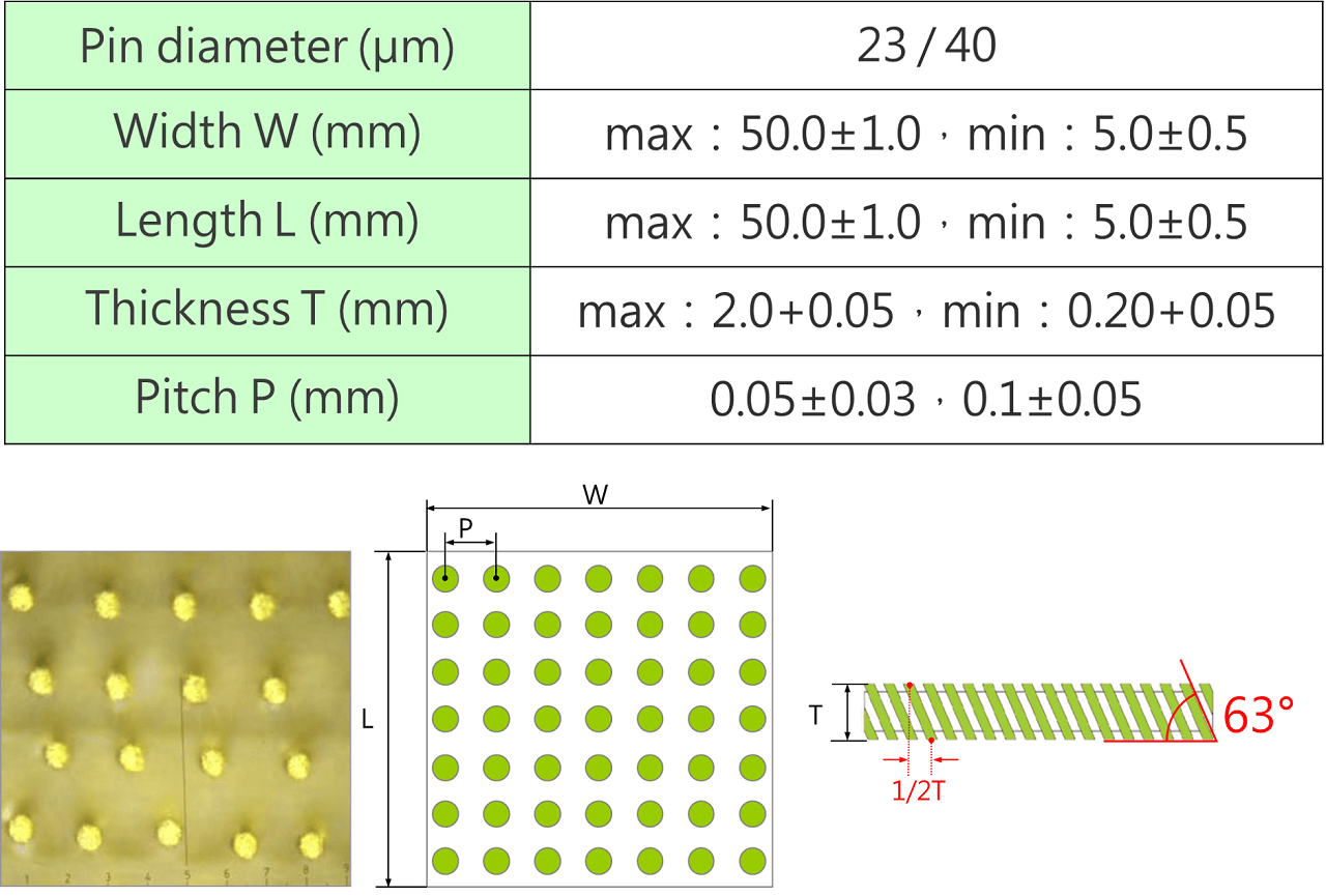 - 40 µm / 23µm diameter metal pins are embedded into a silicone rubber matrix via proprietary techniques
